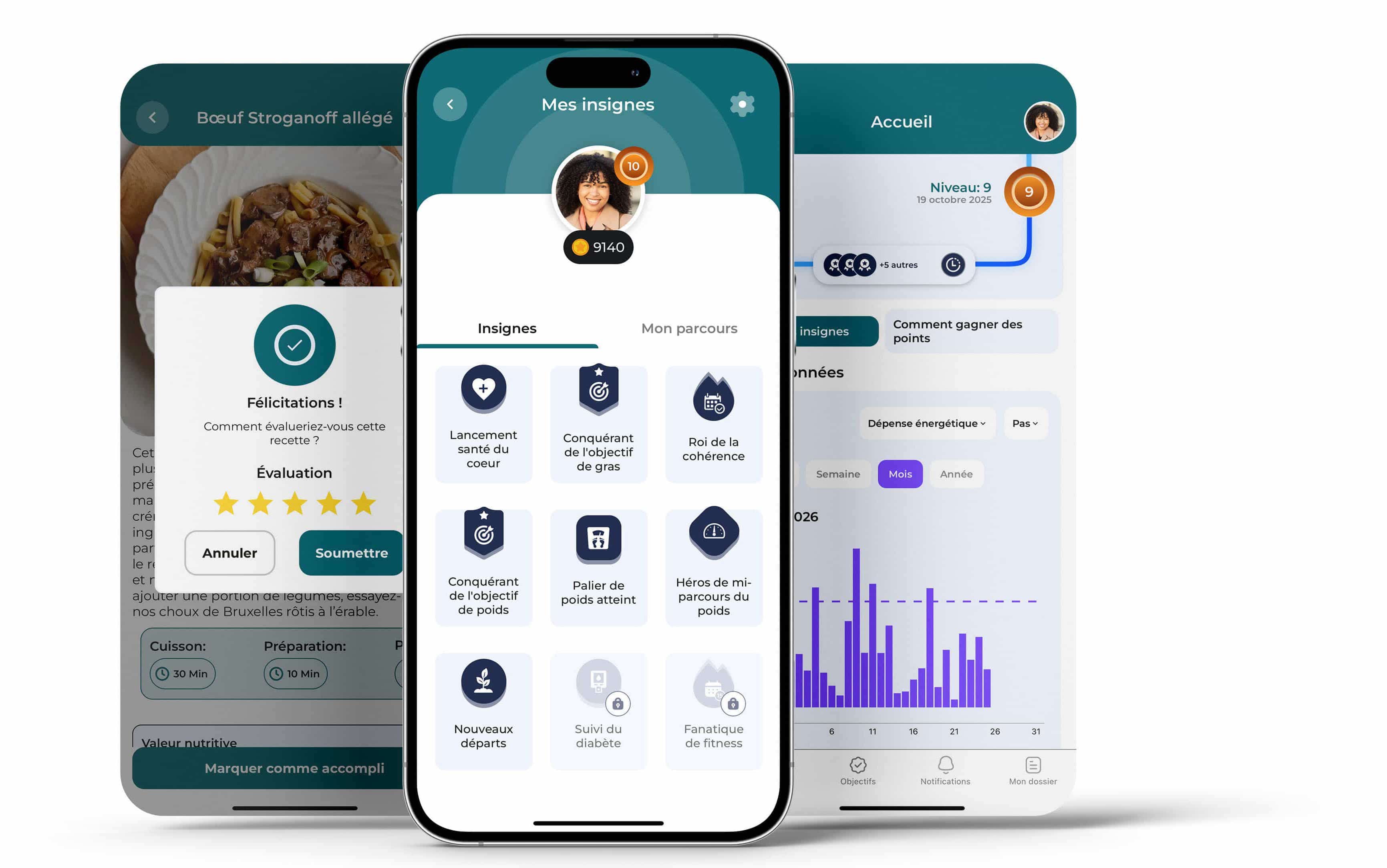 Votre nutritionniste pourra utiliser cette richesse de contenu pour bonifier ses recommandations et défis, assurant que chaque aspect de votre parcours santé est parfaitement aligné avec vos attentes.