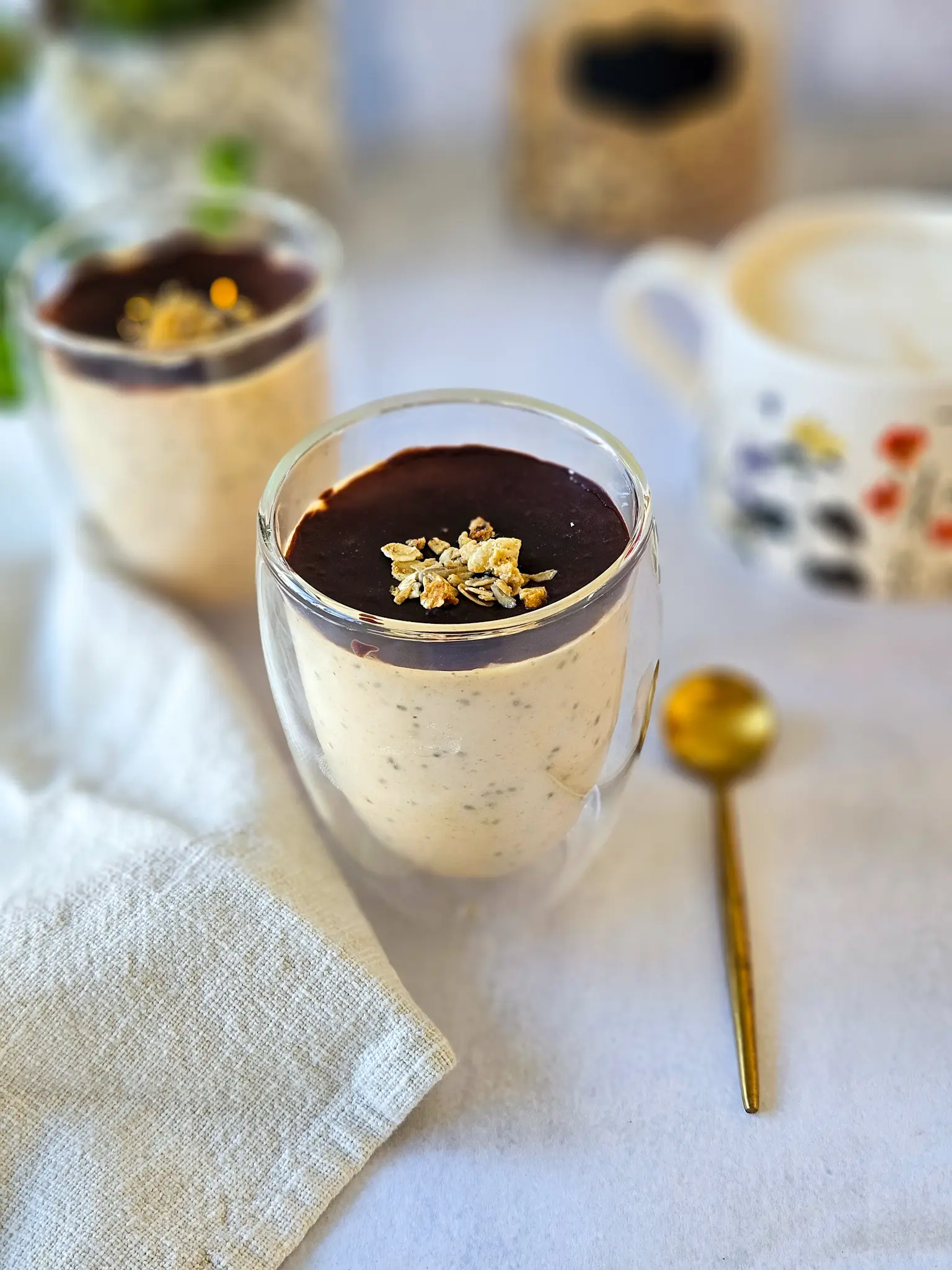 - Dans un bol moyen ou dans un robot culinaire, mélanger le fromage cottage, le beurre d’arachides, le sirop d’érable, la vanille et les graines de chia jusqu’à consistance homogène.