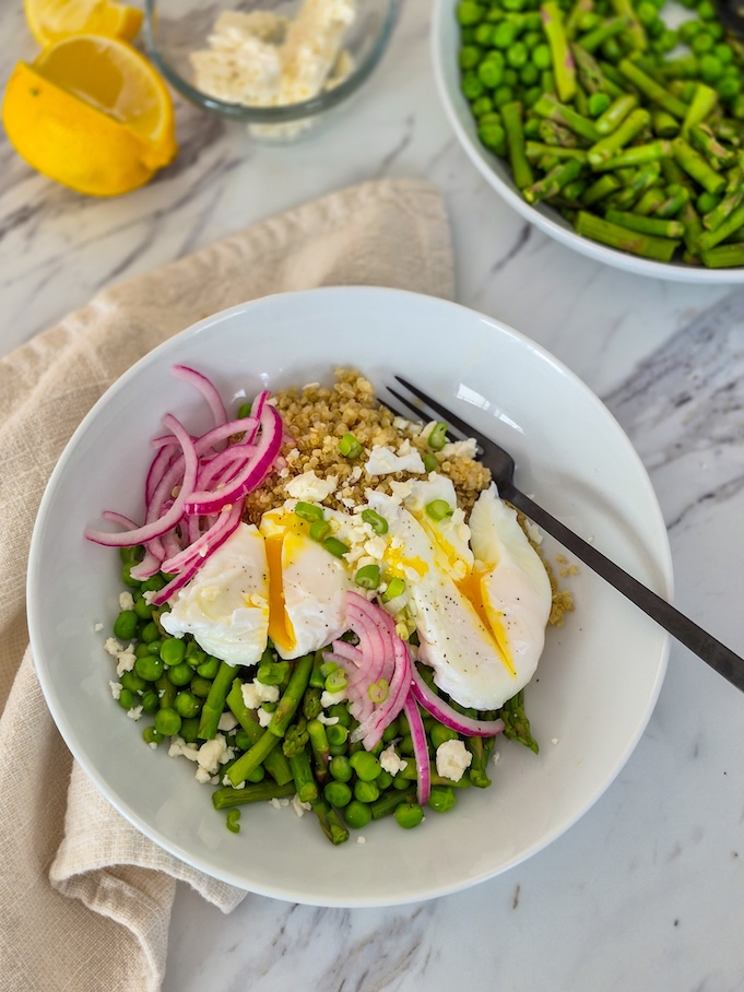 Pour une version faible en FODMAP, changer les asperges pour des haricots verts ou de la courgette et omettre l’oignon mariné.