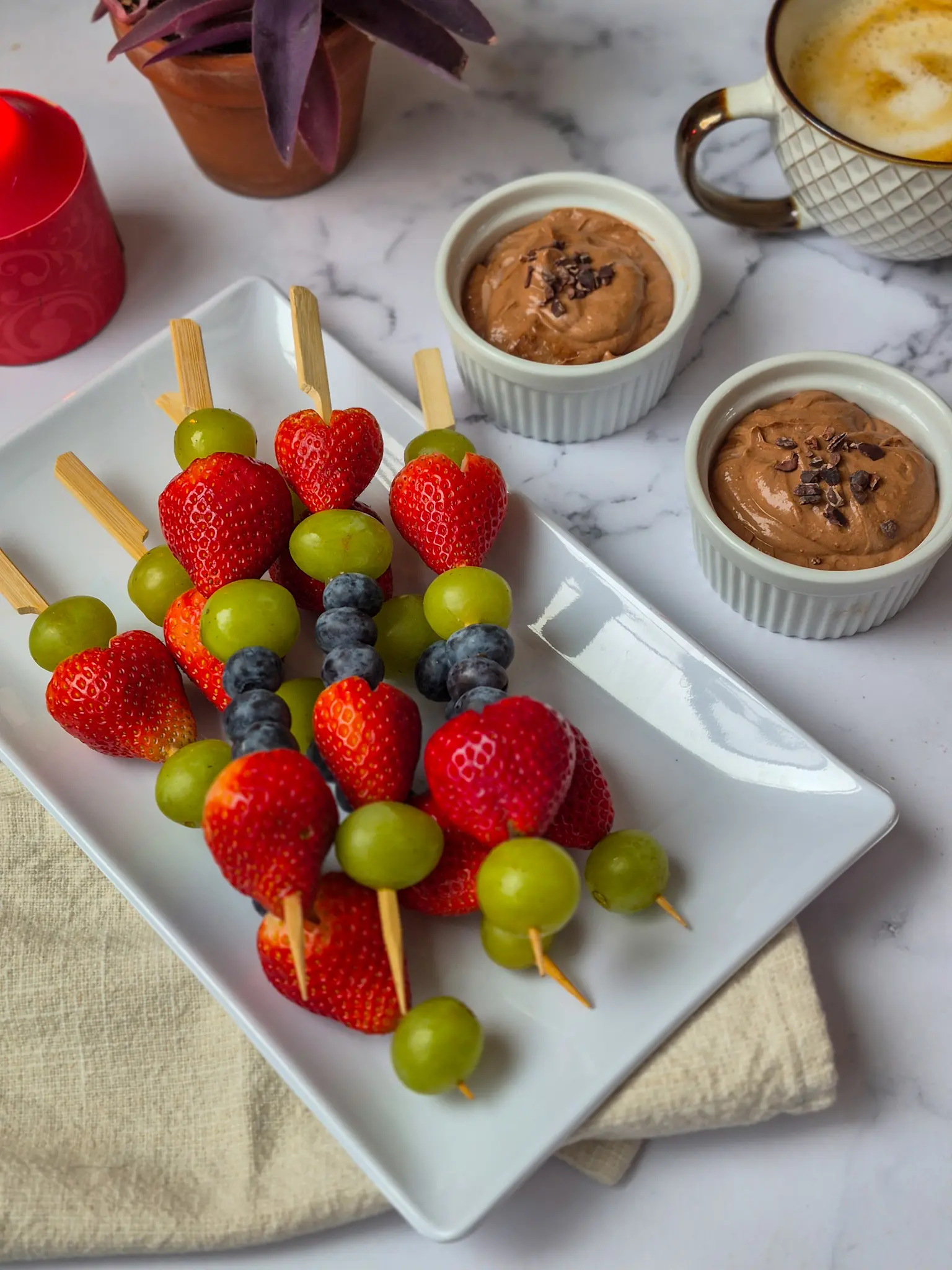 Avec la Saint-Valentin qui approche, voici une collation simple, colorée et nutritive à partager avec un être cher ou à offrir aux enfants en guise de petite douceur. Ces brochettes fruitées accompagnées d’une trempette crémeuse au chocolat sont nées d’une idée originale d’une nutritionniste, une façon amusante et gourmande de souligner l’amour avec des aliments sains. Pour encore plus d’inspiration, découvrez nos 15 recettes santé pour une Saint-Valentin inoubliable.