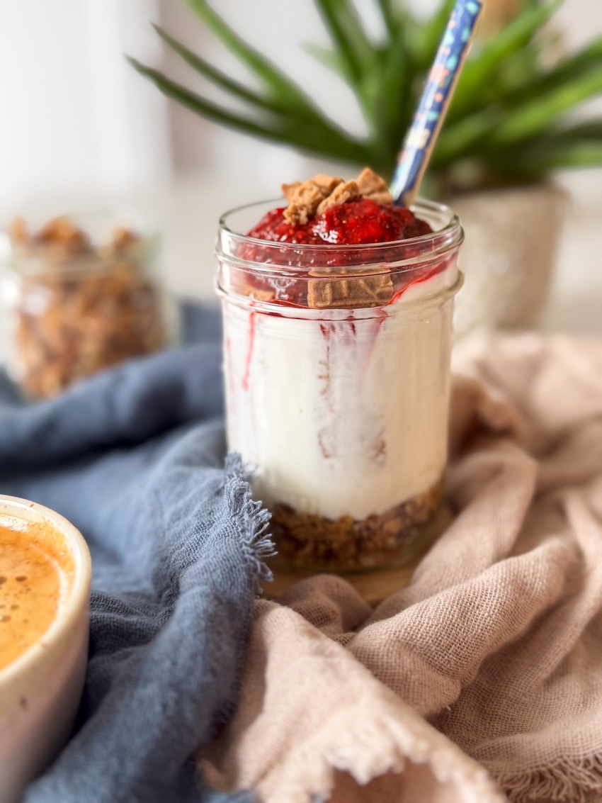 Avez-vous vu la tendance du gâteau au fromage japonais (sans fromage) qui envahit les médias sociaux ? Nous l’avons revisité pour en faire un véritable déjeuner complet, et non un simple dessert. Préparé la veille, il gagne en saveur et en texture : crémeux, légèrement croquant et incroyablement rassasiant. Nos nutritionnistes apprécient particulièrement cette option puisqu’elle est à la fois délicieuse, riche en protéines et en fibres. Pour encore plus d’inspiration, jeter un coup d’œil à nos Deux semaines de déjeuners variés.