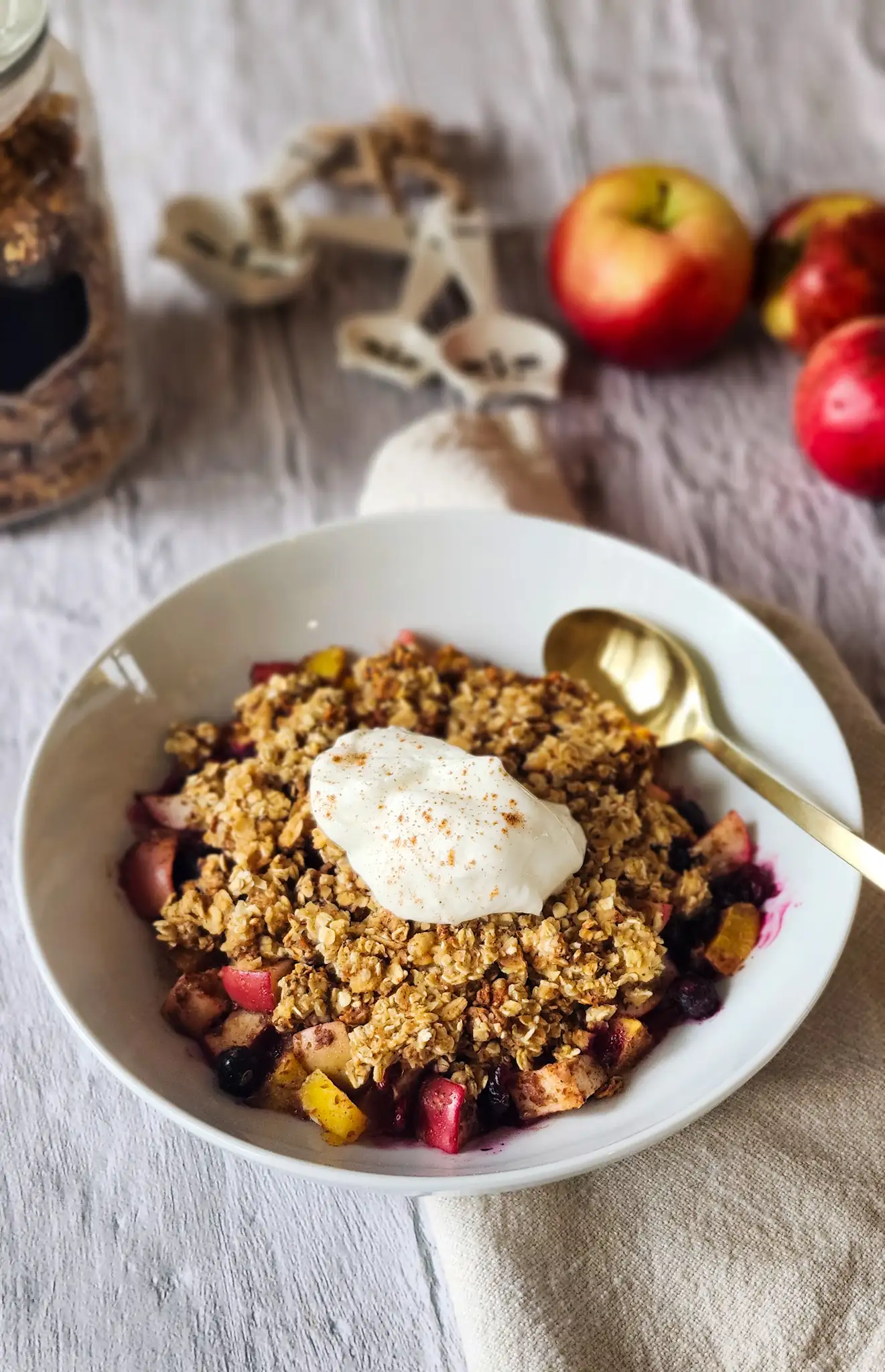 Riche en fibres et rapide à préparer, cette croustade minute est idéale pour une collation réconfortante ou un dessert de semaine. Elle se cuisine directement au micro-ondes en moins de 5 minutes. Essayez-la avec vos fruits surgelés préférés et accompagnez-la d’un yogourt nature. Proposée par une nutritionniste, cette recette s’intègre parfaitement à une alimentation équilibrée! Pour un accompagnement gourmand, essayez la croustade avec ce yogourt glacé à la vanille.
