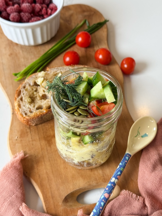 Voici une recette rapide et originale, parfaite pour les matins pressés : une omelette en pot! Nos nutritionnistes aiment beaucoup proposer ce type de déjeuner simple, nourrissant et rassasiant. Accompagné d’une tranche de pain grains entiers et de petits fruits, il offre un bel apport en fibres et en protéines, idéal pour soutenir une énergie stable jusqu’au dîner, sans compromis sur la fraîcheur et le goût. Pour plus d’idées, jetez un œil à nos 10 déjeuners rapides et nourrissants.