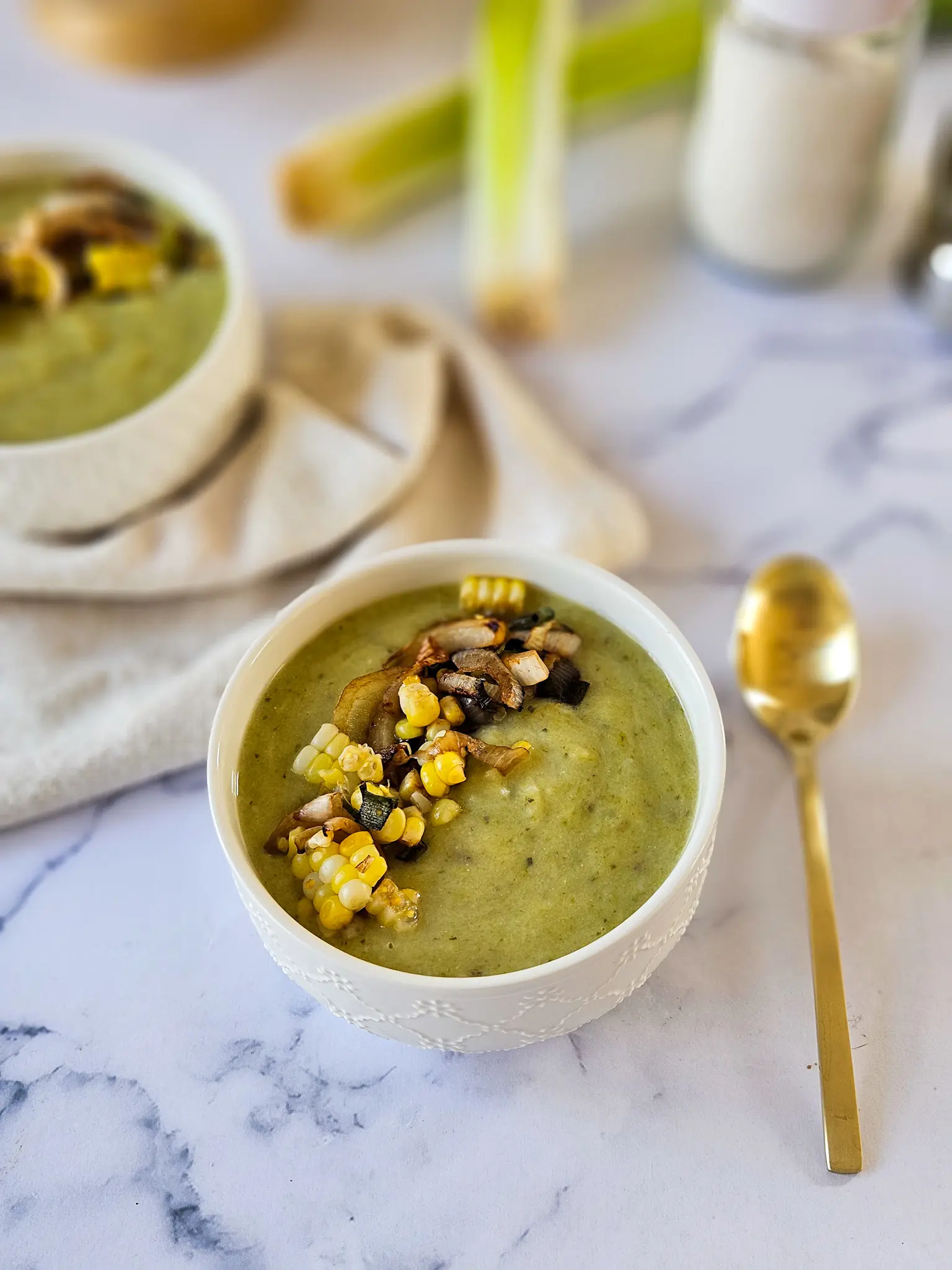 Réconfortant et nutritif, ce potage aux poireaux, créé par une nutritionniste, se distingue par l’ajout de tofu soyeux, une excellente source de protéines végétales qui lui confère une texture onctueuse sans crème. Parfait pour les journées fraîches, il constitue une entrée nourrissante et se congèle facilement. Servez-le avec notre plaque végé au four pour une combinaison réconfortante parfaite.