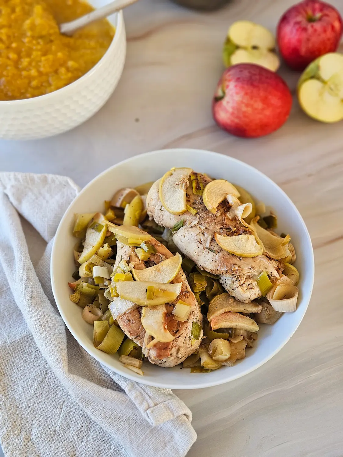 Cette recette automnale allie la douceur des pommes caramélisées à la richesse du poulet pour un repas simple, réconfortant et plein de saveurs. Parfait pour un souper de semaine ou pour recevoir sans tracas. Le mélange d’épices évoque la chaleur d’un plat mijoté, mais avec peu d’étapes de préparation. Une option approuvée par nos nutritionnistes! Pour un repas complet, servir avec une purée de pommes de terre et nos poivrons rôtis au four ou autre légume au choix.