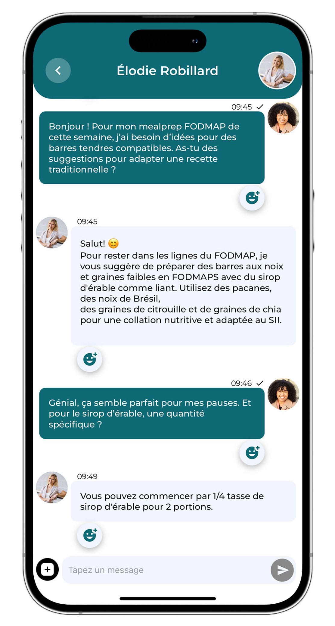 Clavardez et posez vos questions facilement grâce à la messagerie directe : Échanger sur vos défis et vos succès, suivez vos objectifs entre les rendez-vous et retrouvez la motivation grâce à des mots d'encouragement de la part de votre nutritionniste, en tout temps !
